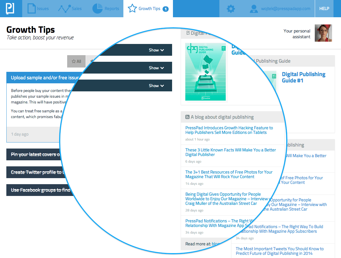 Udostępniliśmy funkcję hakowania wzrostu PressPad o nazwie „Wskazówki dotyczące wzrostu”. Cel jest jasny: pomóc wydawcom sprzedawać więcej subskrypcji i sprawić, by aplikacje czasopism były jeszcze łatwiejsze do znalezienia.