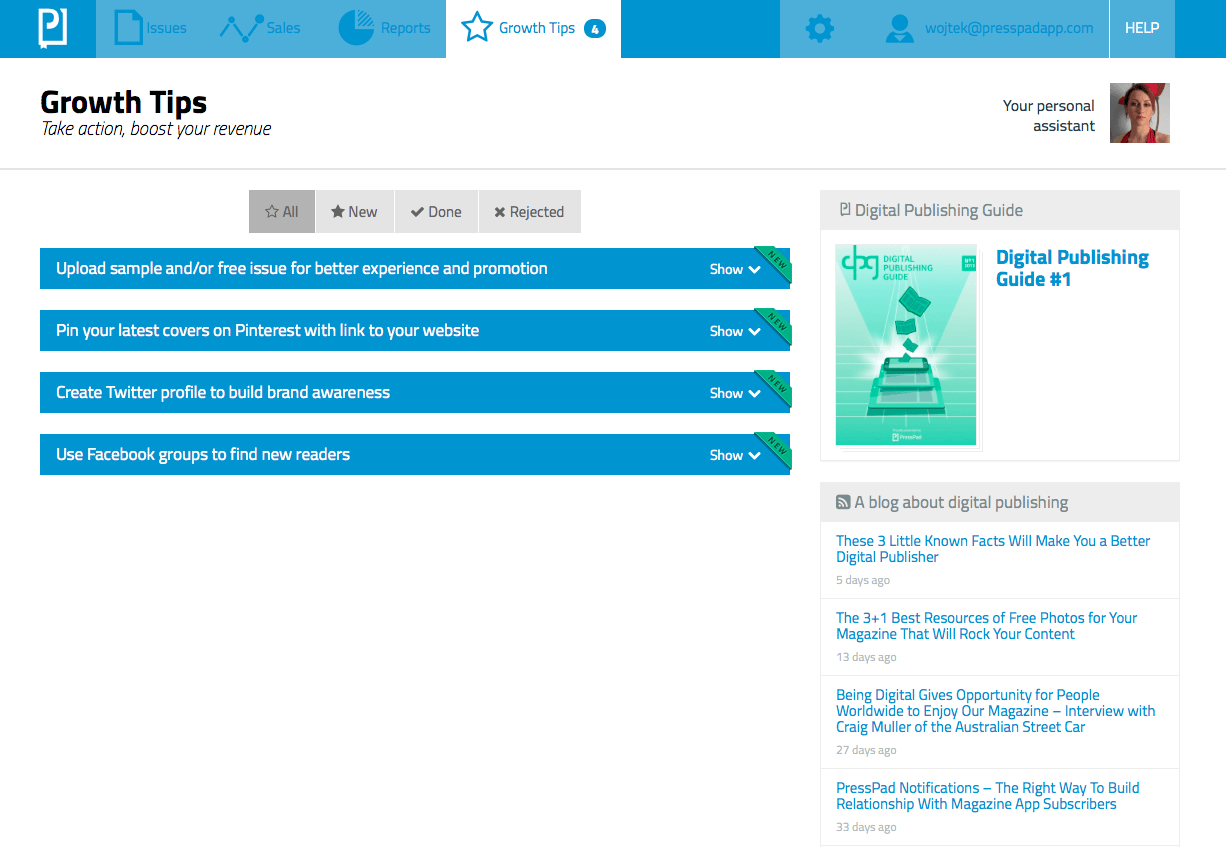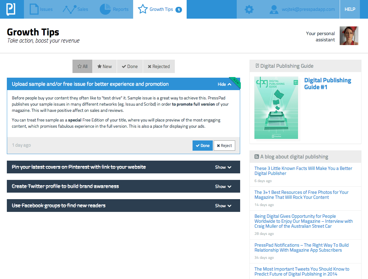 Za każdym razem, gdy pojawi się nowa wskazówka, wydawca zobaczy powiadomienie na górnym pasku swojego konta PressPad. Po kliknięciu na powiadomienie, wydawca zostanie przeniesiony do listy wskazówek, gdzie może zobaczyć szczegóły działania, które należy podjąć. Zwykle jest to krótka notatka opisująca krok po kroku, co należy zrobić (w tym linki, zdjęcia i wkrótce samouczki wideo).